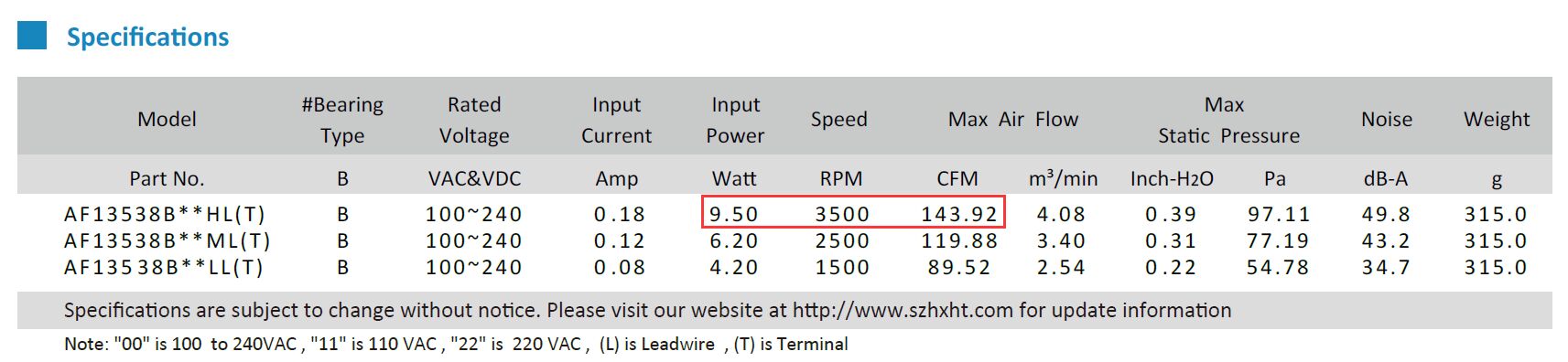 AF/EC13538散熱風扇達到3500RPM的時候,風量為143.92CFM,而功率為9.5W。