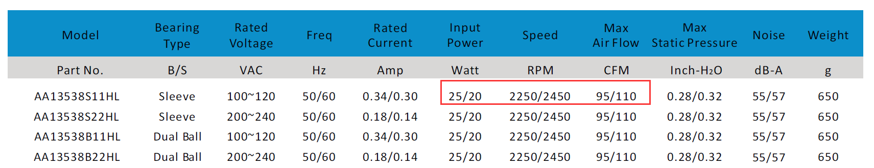 對比于AC13538風扇,最大轉(zhuǎn)速為2450RPM,風量對應為110CFM,功率卻達到了20W,最大風量沒達到AF13538風扇的風量,但功率是其2倍多,也即功耗是AF13538的2倍多。